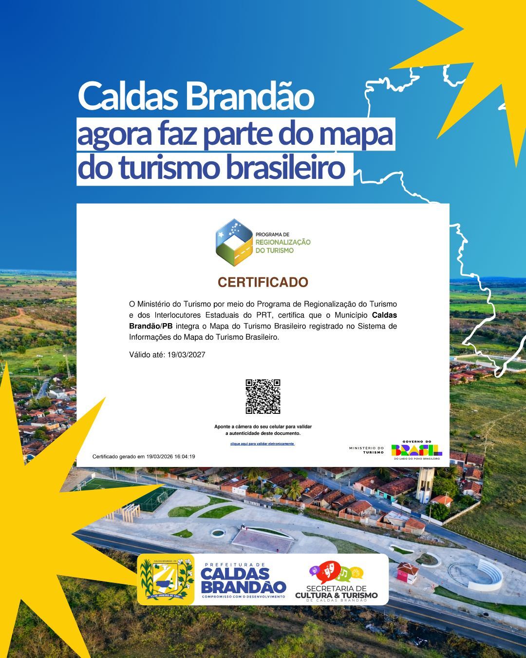 O município de Caldas Brandão, no interior da Paraíba, conquistou um importante reconhecimento na área do turismo. A cidade foi oficialmente certificada pelo Ministério do Turismo e agora passa a integrar o Mapa do Turismo Brasileiro, iniciativa que fortalece o desenvolvimento turístico em todo o país.